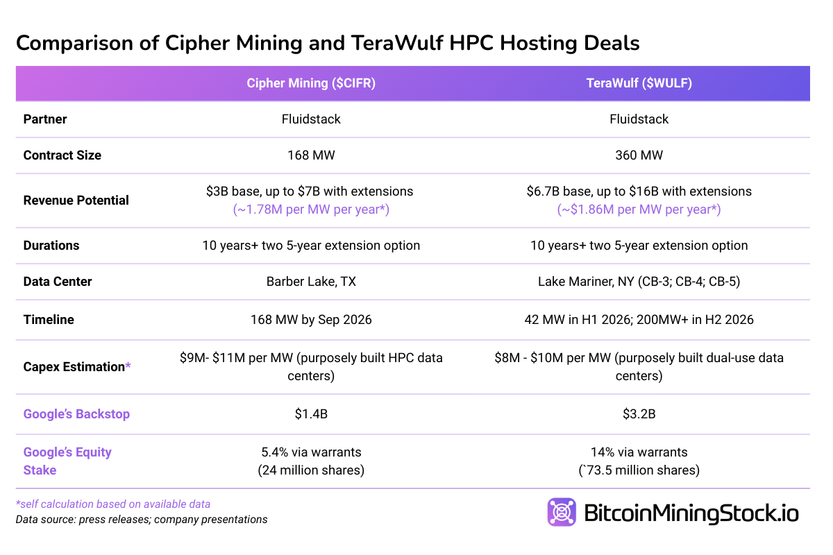 Cindy's Thoughts: This is Cipher Mining鈥檚 first HPC client and the fourth hyperscaler deal in the Bitcoin mining sector. What makes it especially interesting is that Cipher鈥檚 client, Fluidstack, is the same counterparty as in TeraWulf鈥檚 agreement. Both contracts share a similar structure and are backstopped by Google. For more context, you may find my previous article on TeraWulf鈥檚 deal helpful. The following is the quick comparison of the two deals: