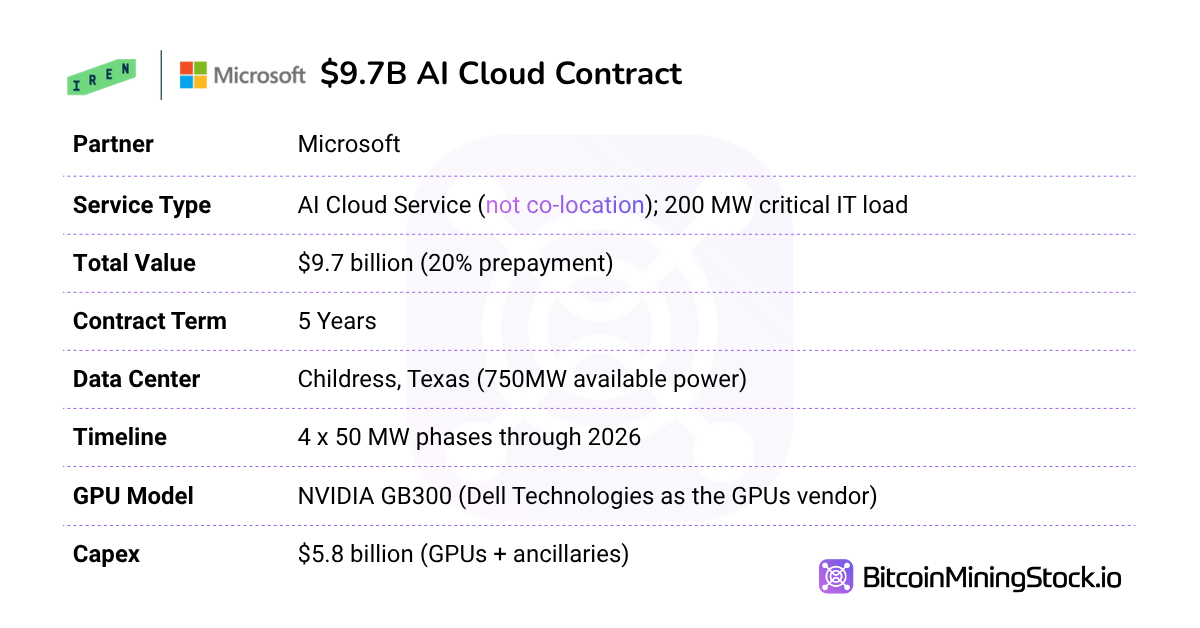 What Happened: On November 3, 2025, IREN signed a $9.7 billion, five-year GPU cloud services contract with Microsoft. Under the agreement, IREN will deploy NVIDIA GB300 GPUs (purchased via a separate $5.8 billion deal with Dell) at its Texas campus through 2026. The contract includes a 20% prepayment and will be funded through cash, customer prepayments, and financing.
