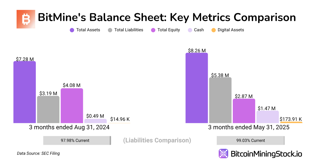 The company reported total assets of $8.26 million, marking a 75.3% increase YoY. The growth was driven by a 195% rise in cash and cash equivalents (from $499,270 to $1.47 million) and a tenfold increase in crypto holdings, now at $173,916. While crypto still represents a modest share of assets in the current quarterly report, the increase reflects BitMine’s changes about treasury strategy.