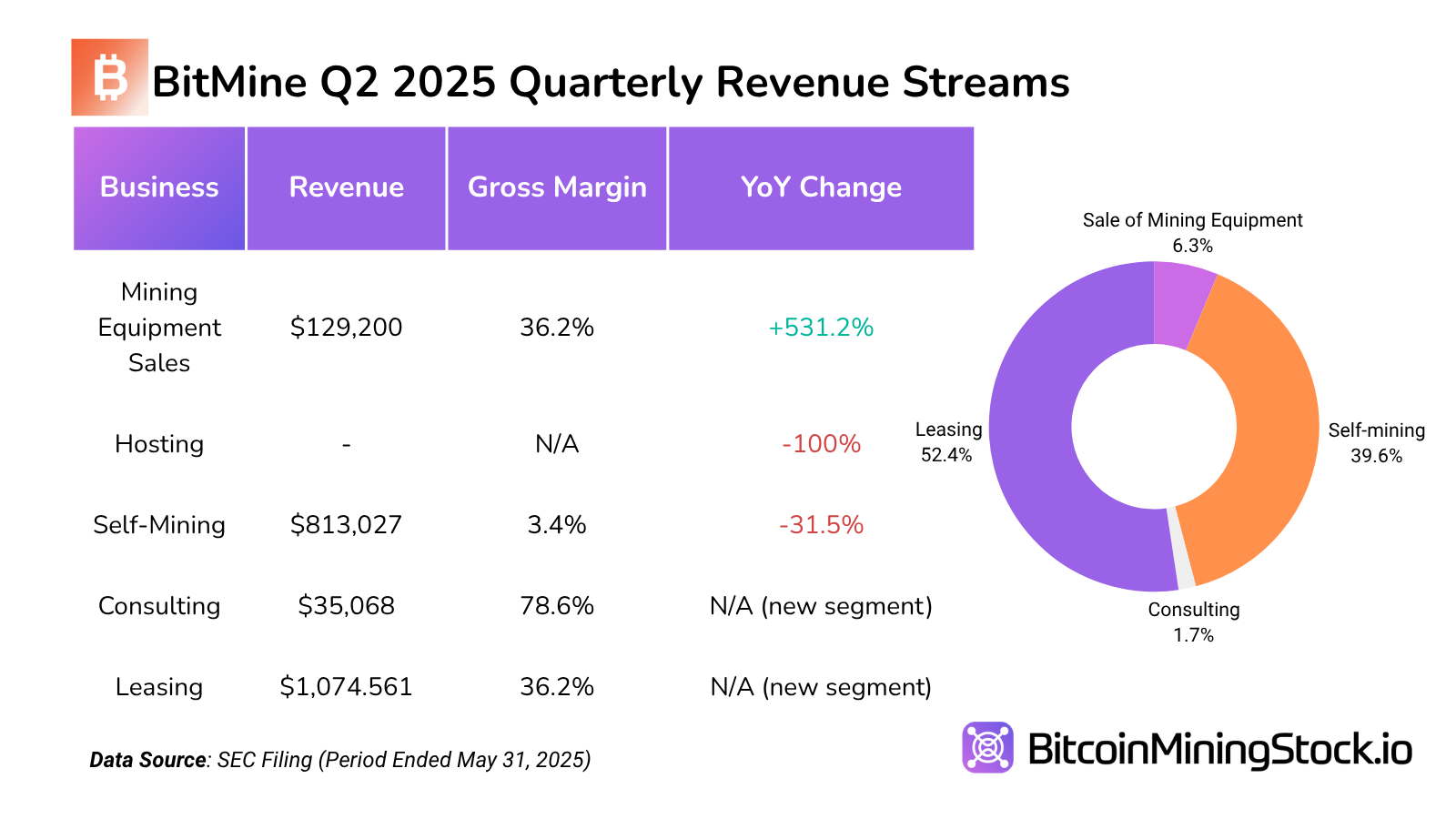 Quarterly revenue came in at $2.05 million, nearly doubling from the $1.22 million in the same quarter last year and up from $1.20 million in the prior quarter. This marks the company’s highest quarterly revenue to date. The growth was driven by their leasing business, accounting for over 52% of total revenue. This segment also delivered one of the highest gross profits at $388,637 (gross margin: ~36.2%). This growth supports BitMine’s move toward a more capital-light and recurring revenue model. If sustained, this model could reduce exposure to mining price volatility and provide steady cash flow.