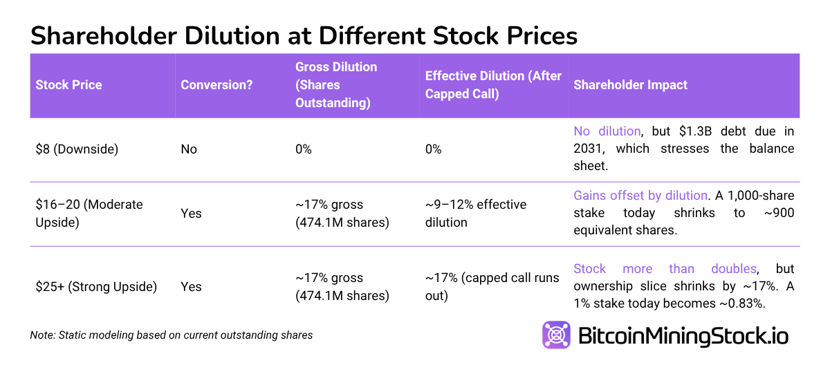 For common equity holders, the impact is straightforward and far less flexible than it is for institutions. Cipher currently has ~393M shares outstanding. If all notes convert, ~81.1M new shares will be issued, lifting the total to ~474.1M, a ~17% dilution. The capped call trims this to 9-12% if shares land between $16.03 and $23.32, but beyond that (>$23.32) the protection runs out and shareholders absorb full dilution.