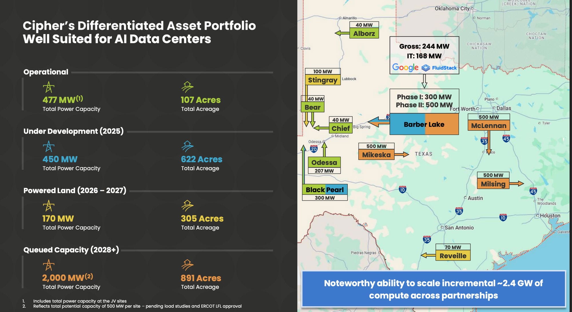 Barber Lake site and Cipher’s broader 2.4 GW pipeline are the backbone of its HPC strategy. Hosting hyperscalers requires massive upfront spending on land, power interconnection, and data center buildout. The Fluidstack contract validated demand, but capital was the bottleneck.
