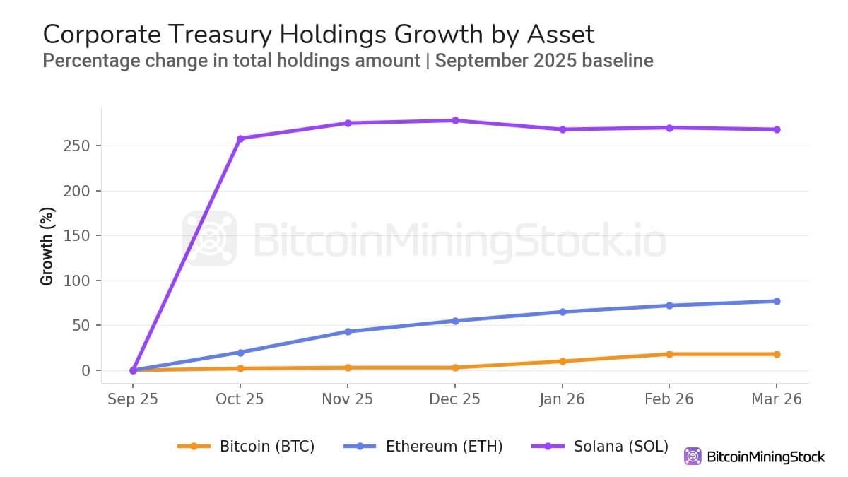 Between September 2025 and March 2026, here is how total corporate holdings shifted across the three major crypto treasury categories: