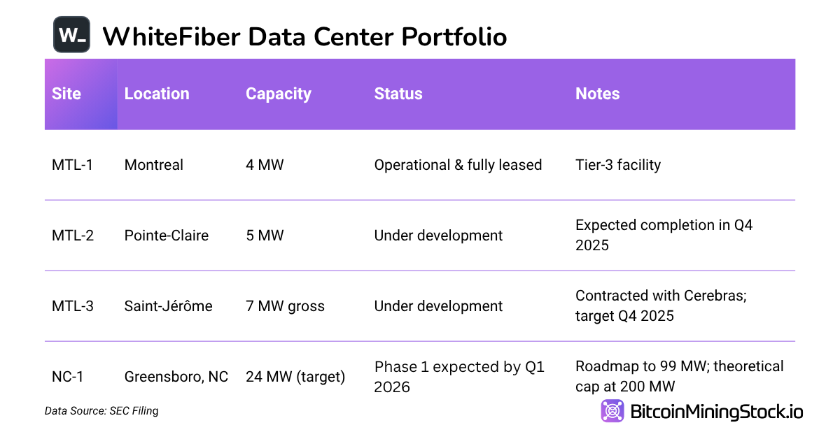 WhiteFiber’s operational portfolio includes: