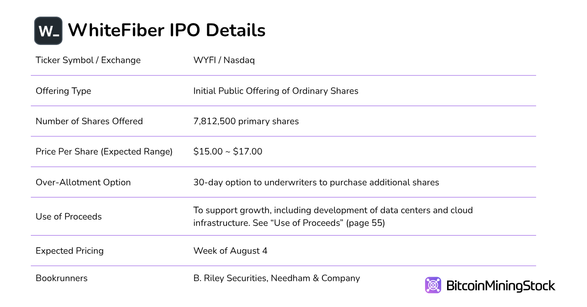 WhiteFiber Inc., the high-performance computing (HPC) and AI infrastructure subsidiary of Bit Digital (NASDAQ: BTBT), has launched its initial public offering. The company is offering 7,812,500 ordinary shares at a proposed price range of $15.00 to $17.00 per share, with underwriters granted a 30-day option to purchase an additional 1,171,875 shares. Upon listing under the ticker WYFI on the Nasdaq Capital Market, WhiteFiber will become a publicly traded provider of AI-focused cloud and data center services.