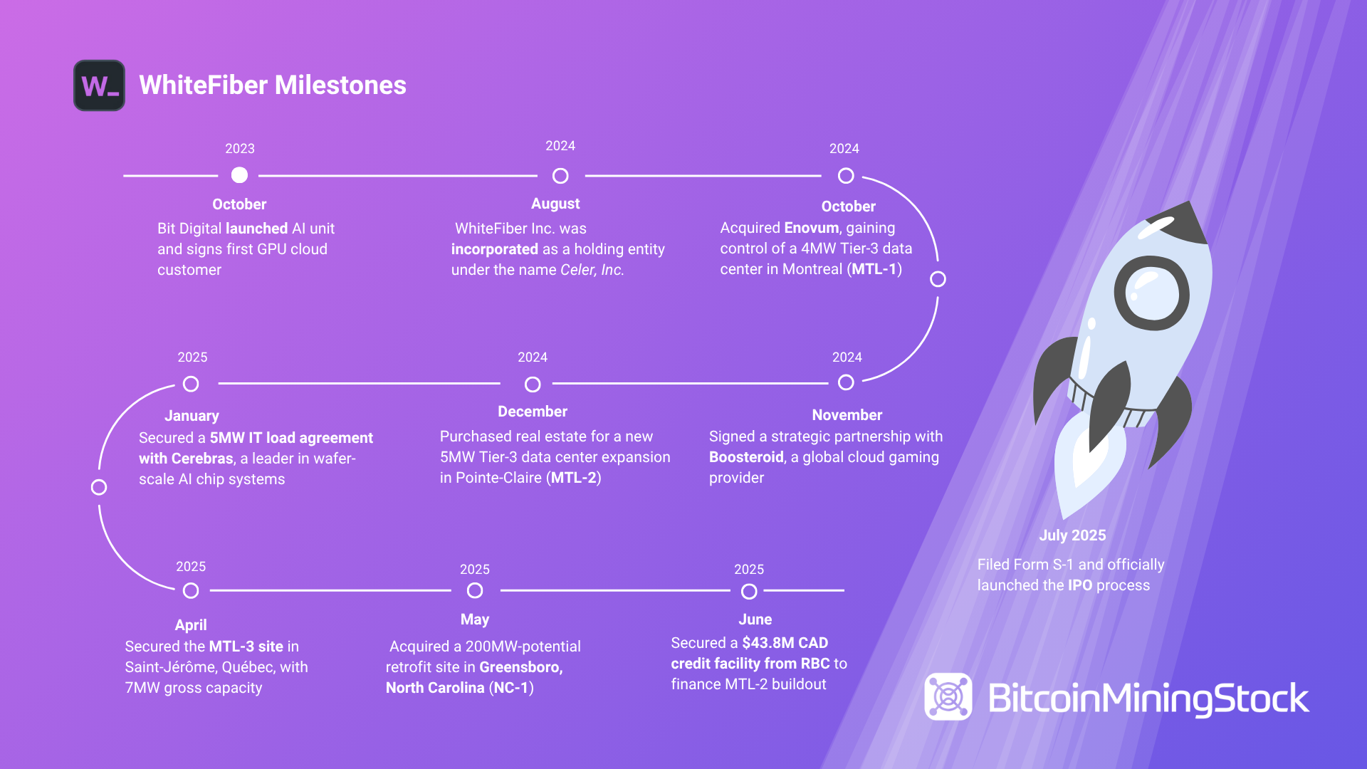 WhiteFiber’s timeline stretches back to October 2023, when Bit Digital launched its AI unit and signed its first GPU cloud services customer under the name Bit Digital AI, Inc. The formal incorporation of WhiteFiber as a holding vehicle followed in August 2024, under the name Celer, Inc. Here’s a condensed timeline of strategic developments:
