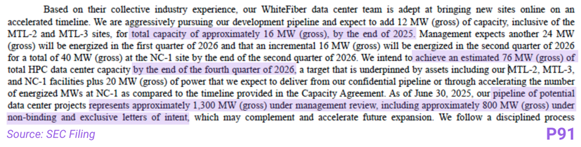 WhiteFiber forecasts reaching 76MW of gross capacity by the end of 2026. The company also notes a broader pipeline under management review totaling ~1,300MW, with 800MW under non-binding letters of intent.