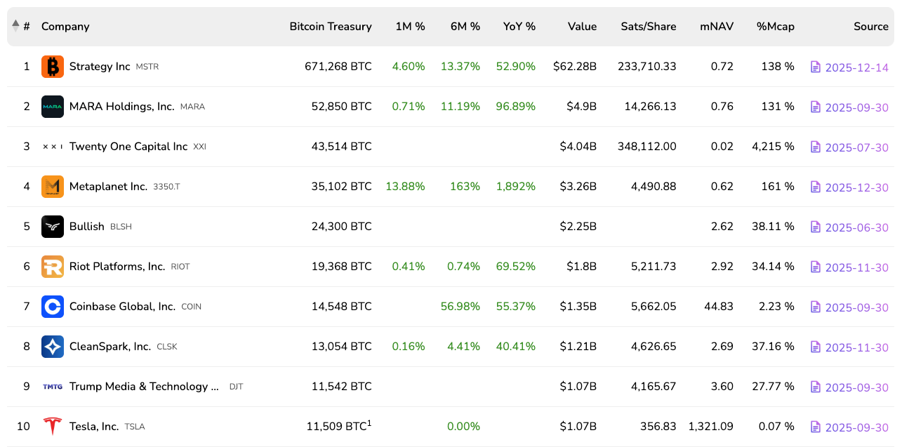 Top 10 Bitcoin Treasury Stocks (by Bitcoin holdings; as of Jan 5, 2026; View live updates )