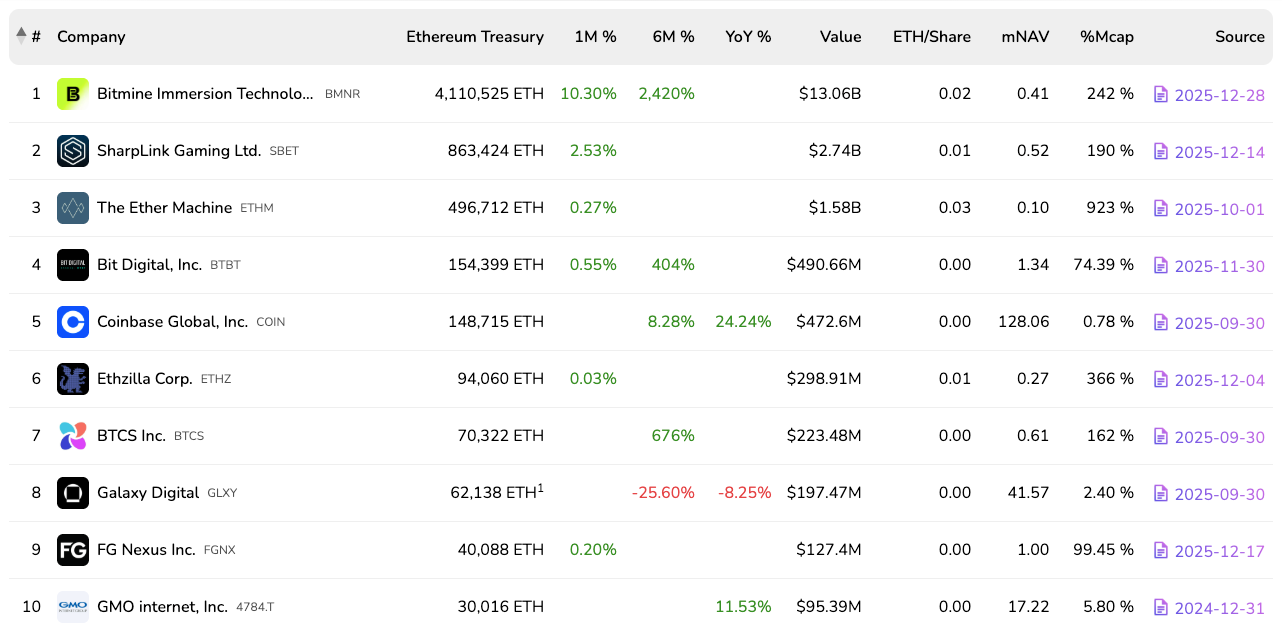 Top 10 Ethereum Treasury Stocks (by Ethereum holdings; as of Jan 5, 2026; View live updates )