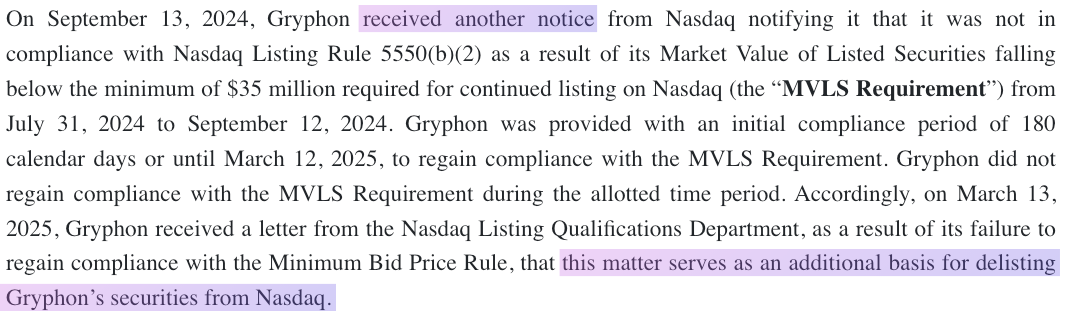 There is also the risk that the merger fails. If the deal is terminated, Gryphon may be required to pay termination fees and could struggle to sustain operations. According to its Q2 filing, Gryphon had just $678,000 in cash and a quarterly net loss of $5.25 million, raising legitimate concerns about liquidity. In a no-deal scenario, Gryphon faces the possibility of delisting from Nasdaq, creditor pressure, or even bankruptcy - a risk explicitly outlined in its S-4 filing.