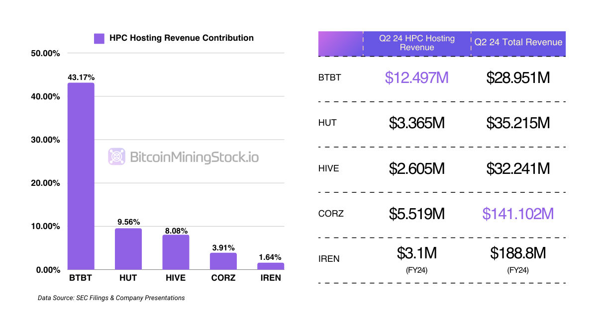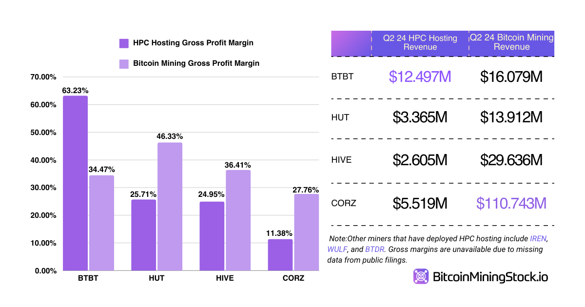 Bit Digital, despite being a smaller-cap company (ranking #15 out of 30 by market cap at the time of writing), generated a significant $12.497 million in revenue from their HPC hosting in Q2 2024, leaving peers far behind. According to their quarterly filing, they deployed 2,048 GPUs in early 2024 at a specialized data center and are considering an upgrade to newer-generation NVIDIA GPUs. This upgrade led to a temporary delay in their purchase order, but the company still received a $30 million non-refundable deposit from the customer. With HPC hosting accounting for 43.17% of their total revenue in Q2, it’s clear that Bit Digital is shifting focus from digital-asset mining—and they’re doing pretty well, especially when you consider their gross margins compared to peers.