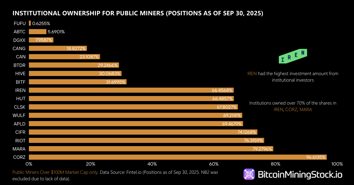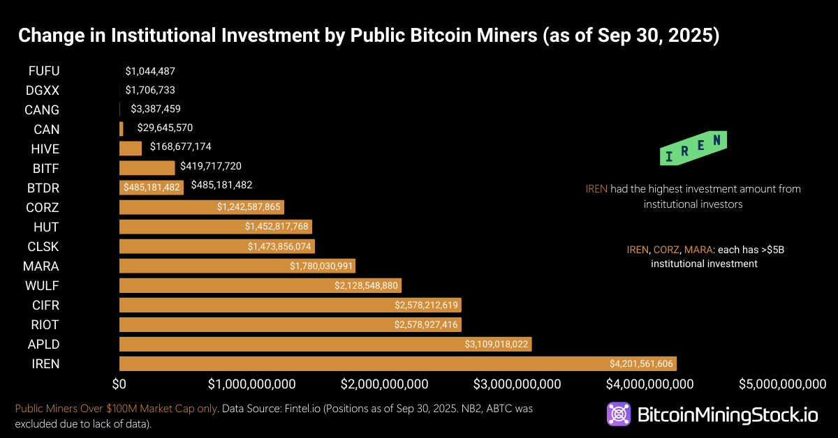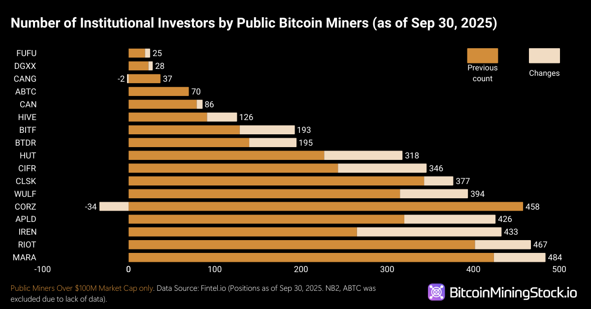 Across the latest disclosures, every publicly listed Bitcoin miner with a market capitalization above $100 million saw an increase in the dollar value of institutional holdings. But the concentration of new ownership tells a more important story.