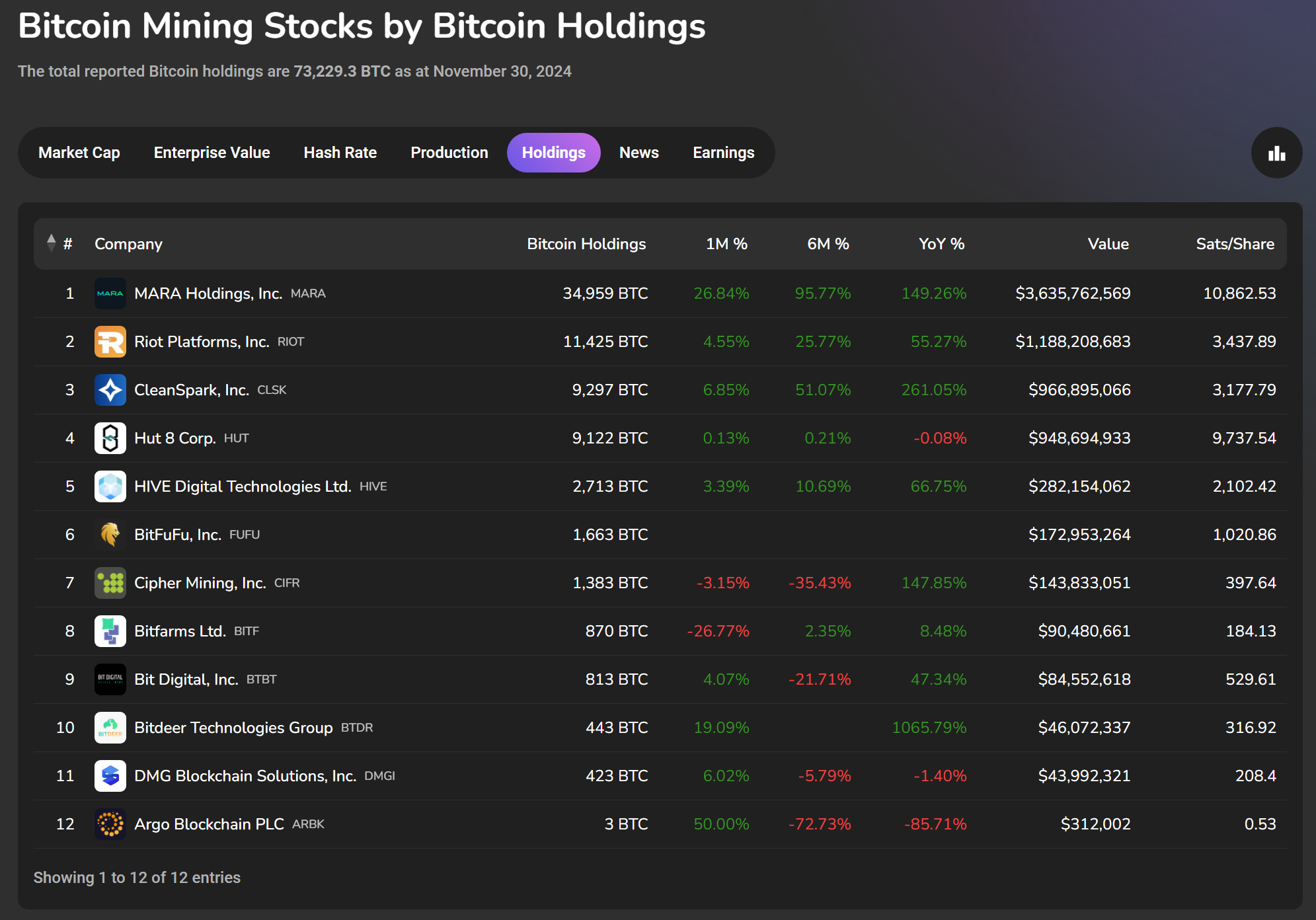 With this move we're now able to display growth or decline of a company's BTC holdings at a glance, with the 1M, 6M and YoY % change columns. We also display the current USD value of a company's BTC, as well as the number of Satoshis (Sats) per Share their holdings equate to. As always, these metrics are available as charts below the table.