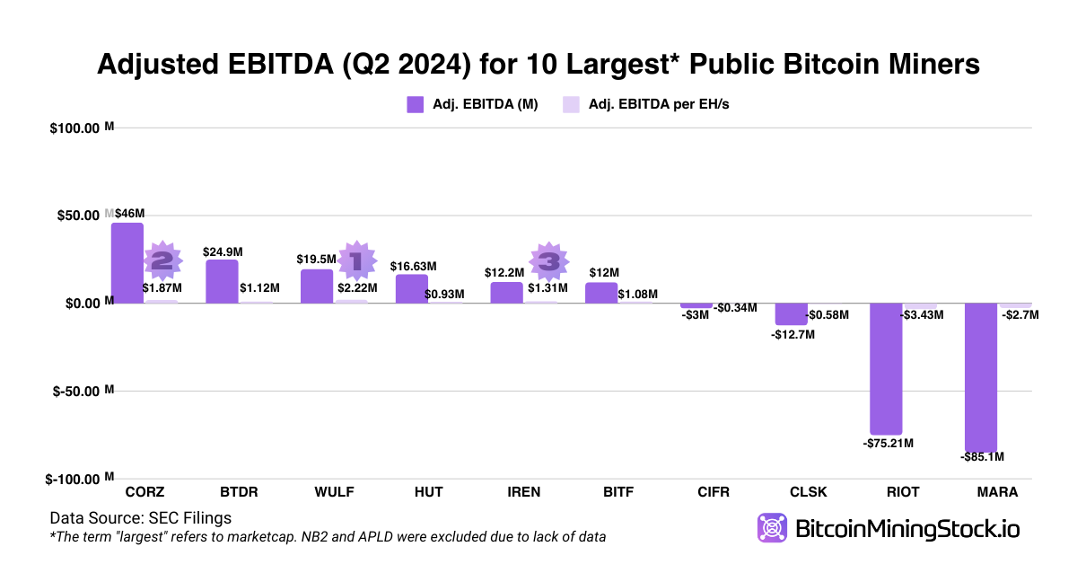 In contrast, 4 of the 10 largest public Bitcoin miners reported negative EBITDA in Q2 2024, ranging from -$3m to -$85.1m. TeraWulf outperformed its peers with the highest adjusted EBITDA per EH/s among these top ten companies. Its debt-free status and cash positions provide greater financial flexibility for scaling operations and investing in infrastructure, positioning it favorably against competitors.